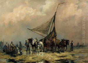 A Coastal Scene With Fisherfolk Sorting The Day's Catch, Beachedfishing-smacks In The Background
