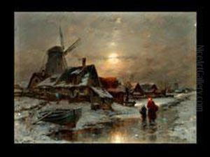 D. "jager Mit Hund In Winterlandschaft Bei Untergehender Sonne". Sign. Ol Auf Karton. 16,5 X 12,5 Cm. Rahmen