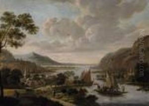 An Extensive Rhine Landscape With Figures Conversing Outside A Towngate