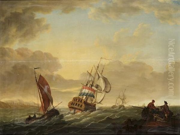 A Dutch Man-o'war And Smalschips Off A Coastline, With Fishermen And A Beached Fishing Boat On An Outcrop