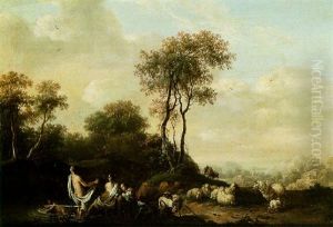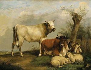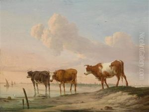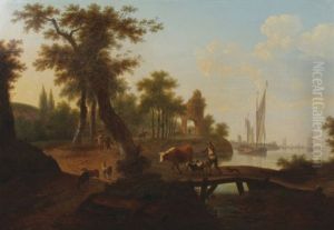 Three Cows Resting In A Wooded Landscape, Sailing Vessels In The Distance (+ Three Bulls In A Stormy Landscape, A Town In The Distance; Pair)