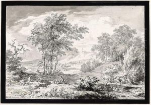 A Wooded River Landscape With Travellers On A Track, A Village Beyond