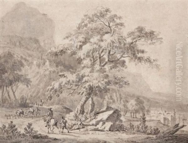 Reizigers Met Paarden En Vee In Berglandschap
