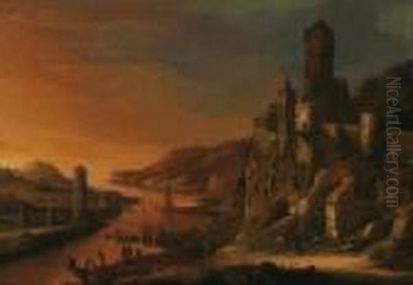 Fortezza Presso Un Corso D""""acqua Con Varie Figure