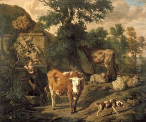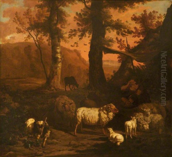 A Landscape with a Shepherd under an Awning surrounded by Sheep and a Goat