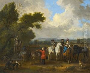 A Huntsman Resting At A Well Conversing With A Woman, A Boy Holding His Horse In Attendance