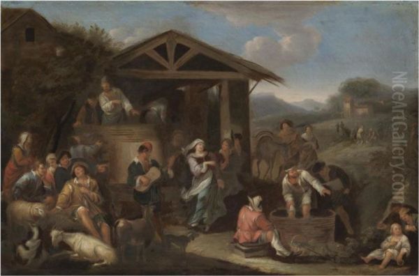 An Italianate Landscape With Peasants Making Merry And Pressing Grapes