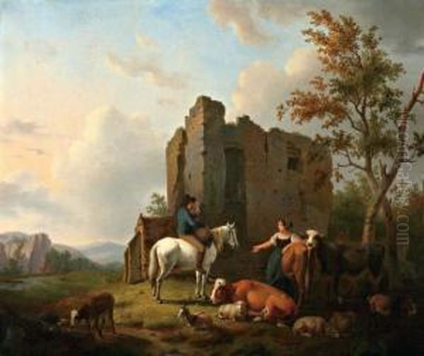 Landschap Met Ruiter En Herderin Met Vee Bij Een Ruine
