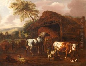 A Milkmaid With A Hen, A Basket Of Fruit, Cattle, Sheep And Goats Beside A Hut In A Landscape