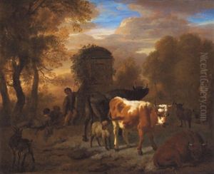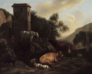 A Herdsman Resting With His Cattle, Goat, Sheep, And A Horse, By Architectural Ruins