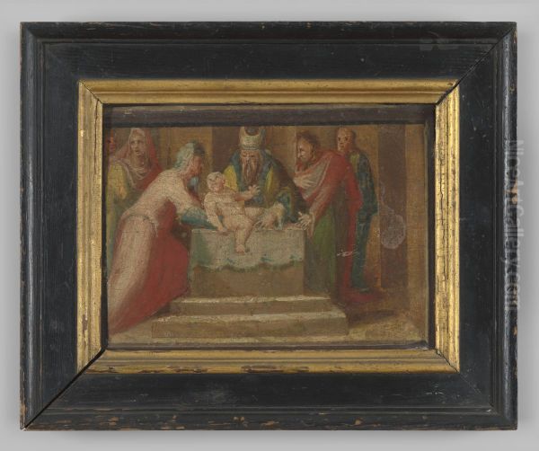 Paneelschildering "De opdracht in de tempel" op hout door een navolger van Domenico Beccafumi, tweede helft 16de eeuw