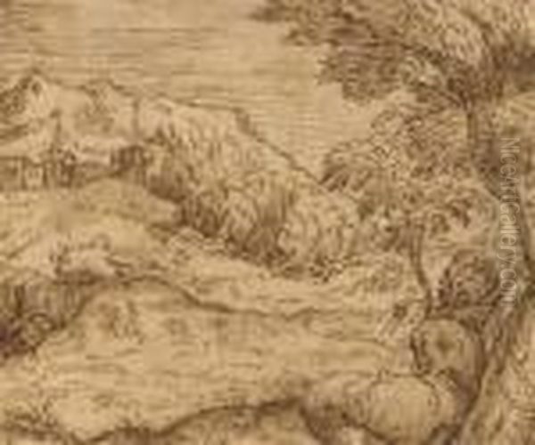Un Paysage Avec Une Figure Accroupie Au Premier Plan, Une Ville Au Fond