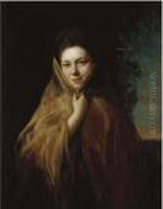 A Young Woman In A White Chemise And Dark Blue Shawl With Flowers In Her Hair