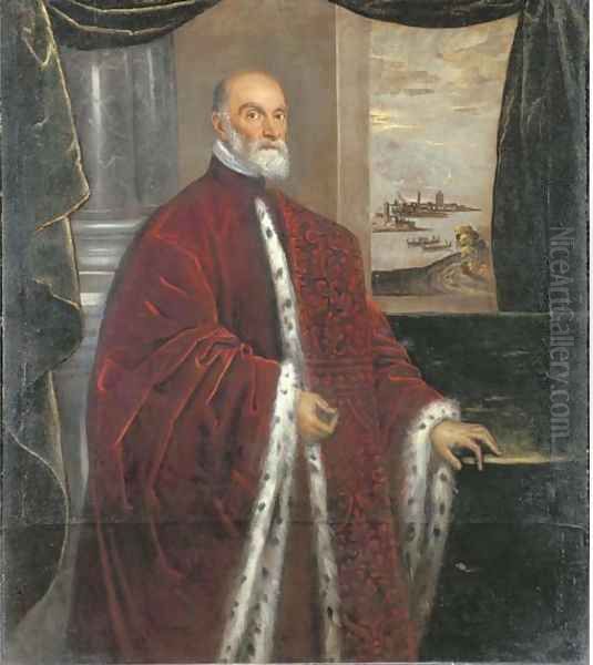 Portrait of a Venetian Senator, three-quarter-length, in robes of office, by a green curtain with a Venetian landscape beyond