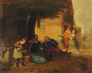 A Maid In A Window Holding A Silver Jug, With A Merry Company Behind A Curtain In The Background