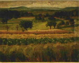 Hugelige Landschaft Mit Bauernpaar Bei Der Feldarbeit