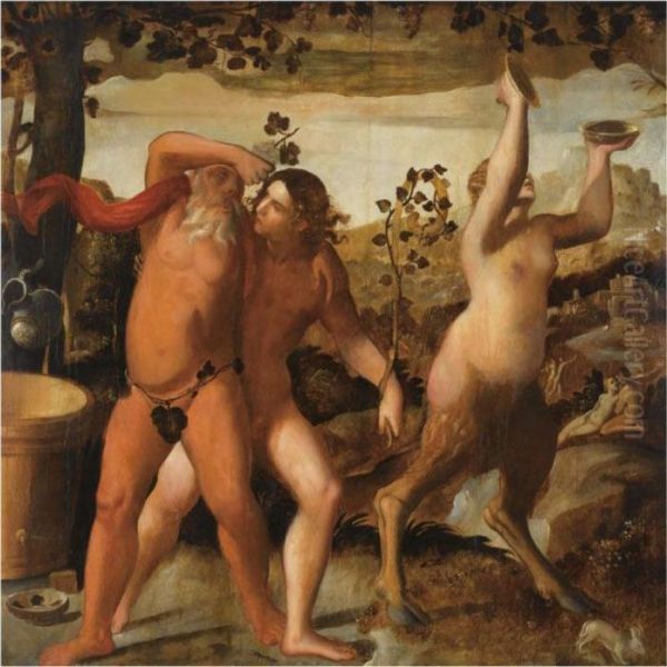 A Bacchanal Scene With The Drunken Silenus And Bacchants Cavorting In A Vineyard