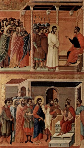 Bring the timeless beauty of Duccio Di Buoninsegna's Maesta, Altarretabel des Sieneser Doms, Ruckseite, Hauptregister mit Szenen zu Christi Passion, Szenen: Christus vor Pilatus und Christus vor Herodes into your home with a handmade oil painting reproduction. Carefully recreated on canvas by skilled artists using traditional techniques, this piece captures the delicate brushwork, subtle light, and vibrant color of the original masterpiece. With museum-level quality and rich texture, it brings elegance and artistic depth to any space. Enjoy free shipping and make this masterpiece a part of your personal collection.