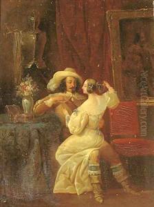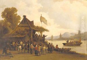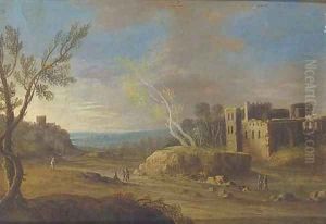 A wooded river Landscape with a horse-drawn Wagon on a Path, and Washerwomen on the Shore by a turreted Villa