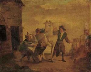 An infant pouring water from a dish, flanked by a horse, a rabbit and two goats, two figures with a cow in the background
