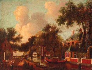 View of a fortified drawbridge by a canal, a gateway leading to elegant buildings to the right