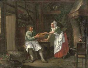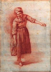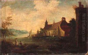 A wooded river Landscape with a horse-drawn Wagon on a Path, and Washerwomen on the Shore by a turreted Villa