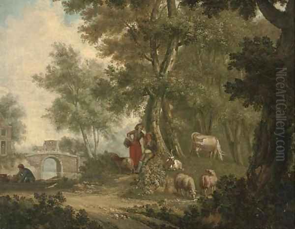 A wooded river landscape with a shepherd and shepherdess resting under a tree with their flock