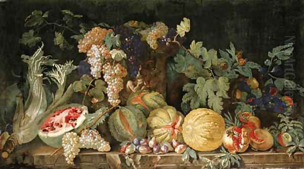 Melons, plums, pomegranates, figs, grapes, cardoon and other fruit by a sculpted urn on a stone ledge