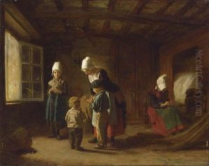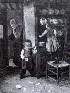 Girls With A Finch In A Kitchen Interior