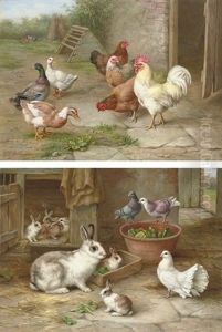Chickens And Pigeons In A Farmyard (+ Ducks And Rabbits In A Farmyard; Pair)