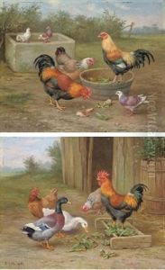 Cockerels, Hens And Doves In A Farmyard (+ Cockerels, Hens And Chicks In A Farmyard; Pair)