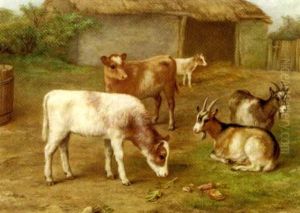 A Farmyard Scene With Goats, Chickens, Doves And Pigeons