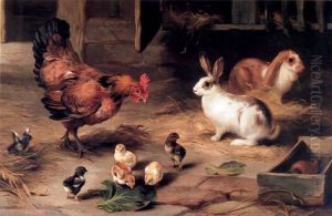 A Hen With Her Chicks And Two Rabbits In A Stable