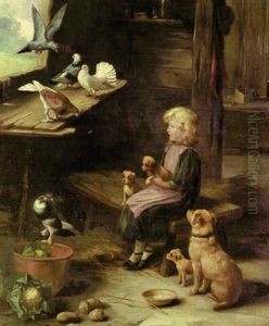 Cockerel, Hens And Puppies At A Cottage Doorway