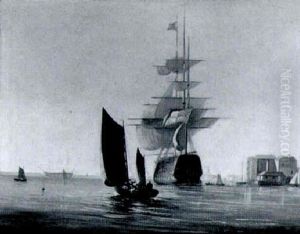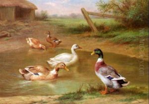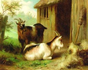 Hens Nesting, A Cockerel And A Rabbit In A Barnyard