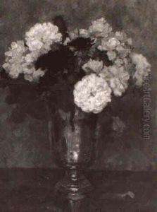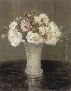 Still Life Of Roses In A Ceramic Vase With A Book And A Fan On A Tabletop