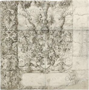 Etude De Dessus De Porte En Stuc, Putti Et Sanglier Pres D'un Blason