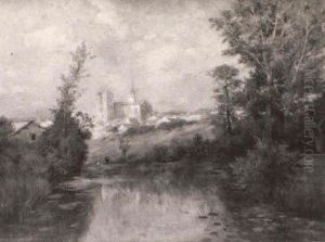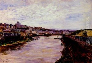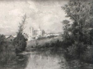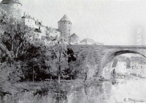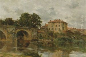 Franskt Flodlandskap Med Bro Och Stadsvy