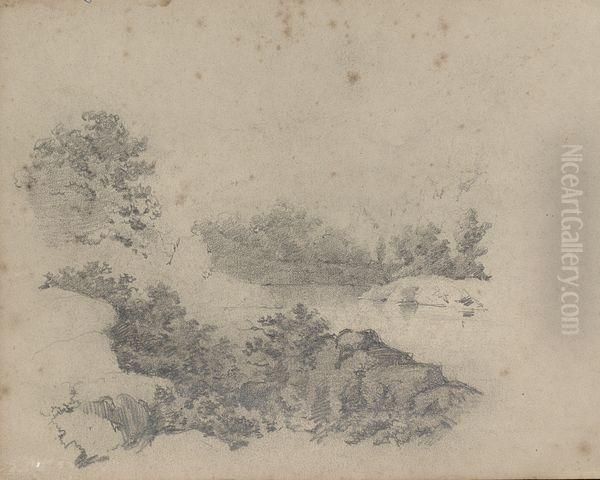 Etude De Paysage, Au Dos Personnages Sur Un Pont De Bateau.