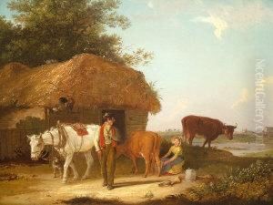 Cattle With Figures And Dog By A Thatched Barn, A River And Church Beyond