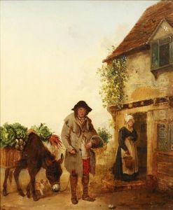 A Farmer With His Donkey And His Collie Watching A Basket Weaver At Work On A Chair