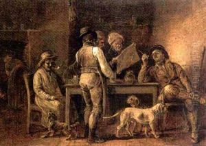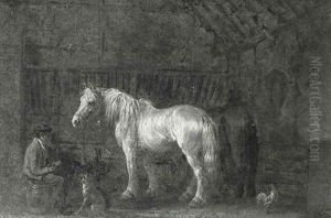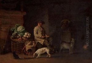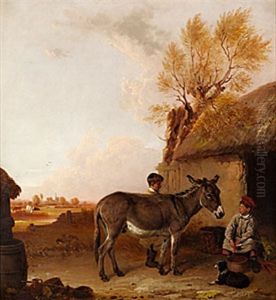 Preparing Carrots For The Donkey, With Sheep And A Dog In A Landscape