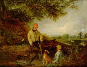 Dogs Rabbiting In A Woodland Clearing, A Sportsman Beyond