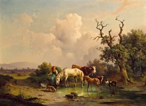 Magd Mit Tieren An Der Tranke