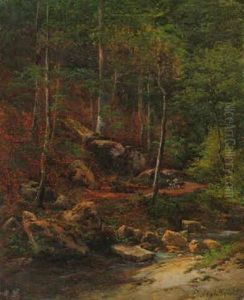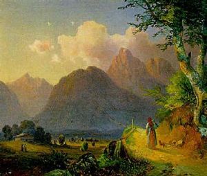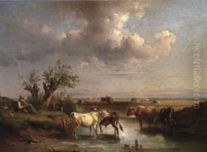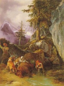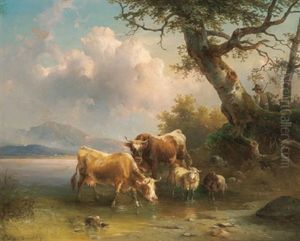 An Alpine Landscape With A Peasant Woman With Her Cows, Sheep And Goats In The Foreground
