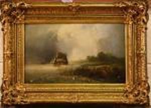 Figures On A Ferry Boat In A Mountainous River Landscape