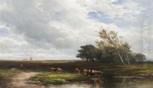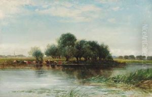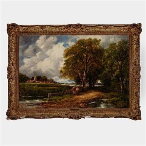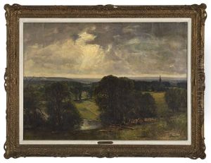 An Extensive Lowland Landscape, Sheep And Cattle Grazing In The Foreground With A Nearby Watermill Distant View To A Church And Hamlet Beyond