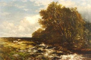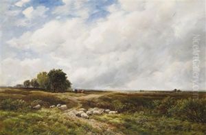 Flock Of Sheep In A Moorland Landscape With Trees To Left Foreground