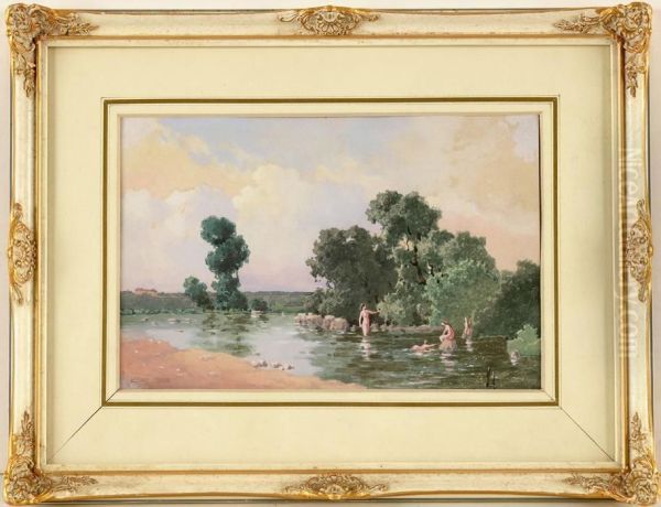Uferlandschaft Mit Badenden Jungen Frauen
