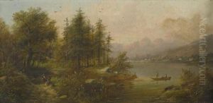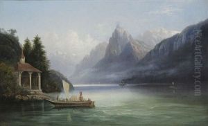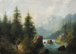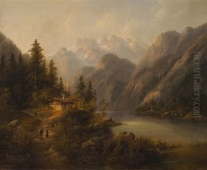 Alpenlandschaft Mit Hausergruppe An Gebirgssee Und Figurenstaffage